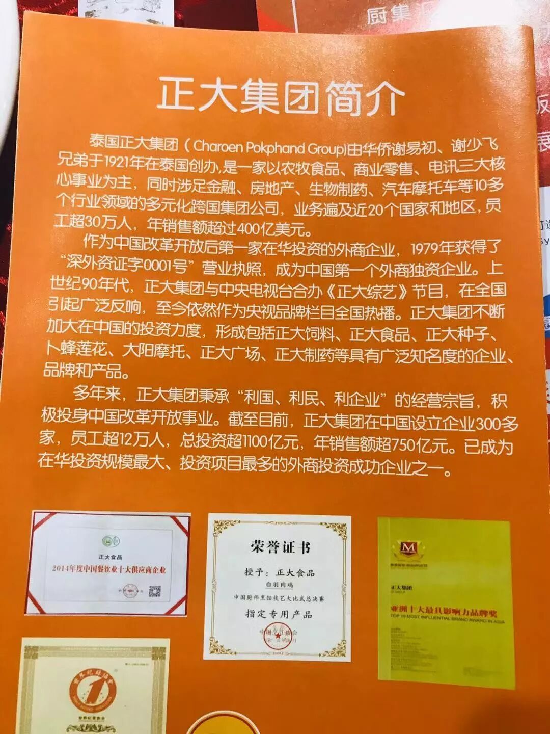 正大食品包括鸡鸭猪等生鲜和熟食系列产品。采用荷兰、美国等国家的先进加工设备,保证了食品的新鲜、营养和美味,符合现代生活需要,畅销全国并远销海外市场,深受消费者信赖。国家体育总局训练局运动员专用产品。正大集团旗下一条龙企业生产的“双大”牌、“正大秦皇”牌、“德大”牌鸡肉为中国名牌产品。