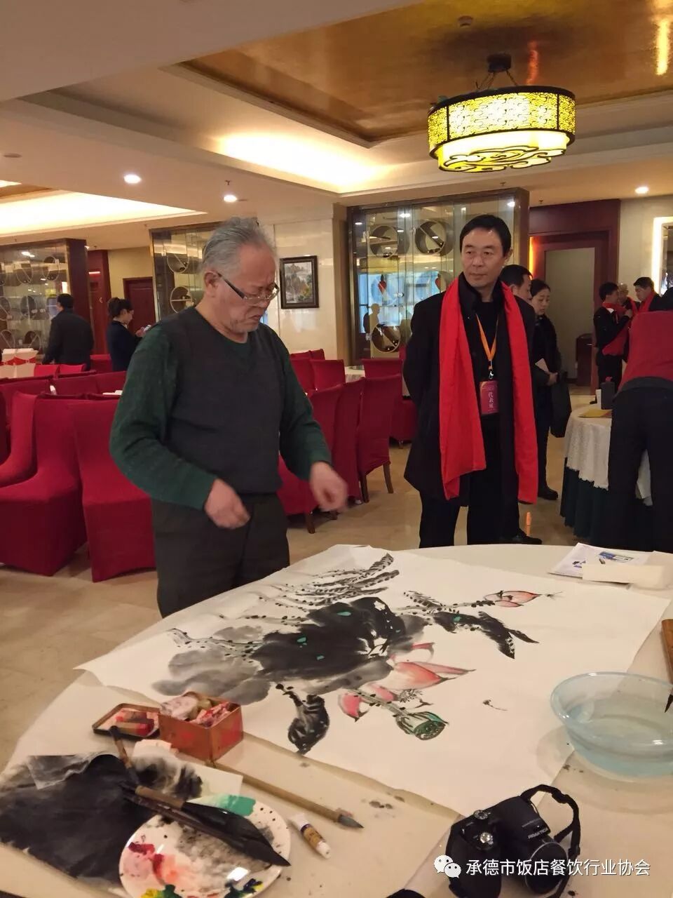 本次活动由承德市婚庆协会会长李欣先生主持,承德市饭店餐饮行业协会侯广江先生做了协会2017年工作报告和2018年工作要点;来自天津天财商龙的餐饮专家先后为大家讲解餐饮业的一些成功案例;承德市烹饪协会会长、国际烹饪大师孙晓春先生为大家分享中餐的国际化经验。承德市饭店餐饮行业协会盛江洪书记公布2017年度荣誉会员企业并予以表彰;承德市饭店餐饮行业协会常务副会长冀国强先生发布了承德饭店餐饮网,宣读了互联网+餐饮的新理念。鸿福书画院的部分书画家现场泼墨,为本次大会助兴。