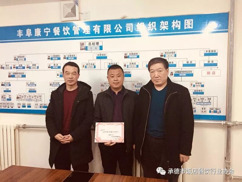 会后,丰宁县餐饮协会会长盛玉东为刘磊总经理颁发副会长聘书,并合影留念。